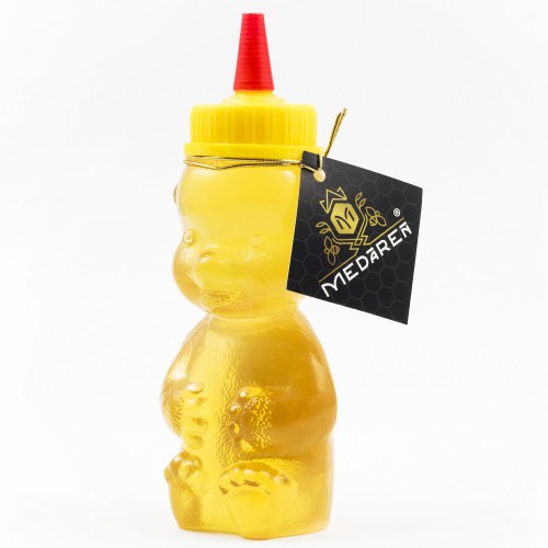 Plastový medvedík, v ktorom je med balený, dodáva produktu zaujímavý vzhľad a robí z neho ideálny darček pre najmenších. Medvedík je veľmi praktický, pretože sa dá ľahko otvárať a zatvárať a môže sa nosiť so sebou kdekoľvek. Je tiež možné použiť ho ako dekoračný prvok v kuchyni alebo na stole.